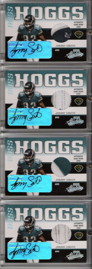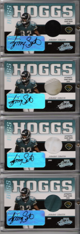 I completely agree with you about this. I have spent the last eight years amassing the world's greatest collection of Jacksonville Jaguars' wide receiver Jimmy Smith; and I have over 30 true 1/1's, dozens of press plates, and original art from Topps Gallery and Gridiron Kings. But I still think the most amazing aspect of my collection is that I own 16 copies of probably his best non-1/1 card -- the 2001 Absolute Boss Hoggs Game Used Shoe/Auto numbered to 25.