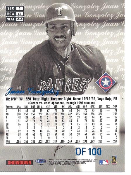 1998 Flair Showcase Legacy Collection Row 0 #44 Juan Gonzalez/100 Replacement card.