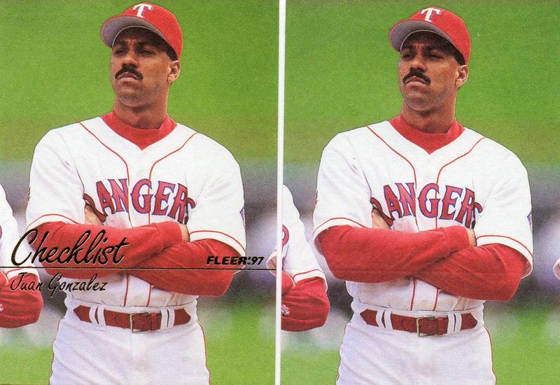 Here's checklist card number 747 from the 1997 Fleer set. The version on the list has the word "Checklist" with a horizontal line running across it. I also have a version on which the gold script is missing without the line or the word "Checklist".