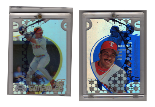 2- #48 2002 UD Authentics Reverse Negatives 3- #R42 2000 UD Ionix Reciprocal Error (Ivan Rodriguez Back, Juan Gonzalez Front) 4- 1999 Upper Deck Black Diamond (Sean Casey on Front) |