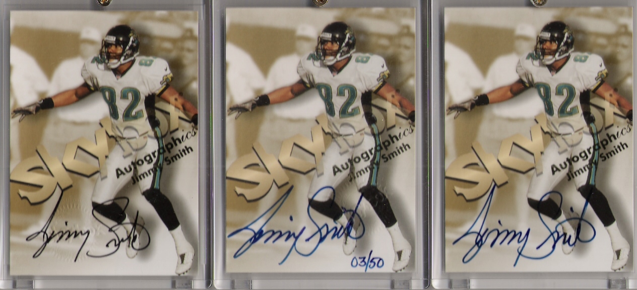 I have three versions of the Autographics card for Jimmy Smith: black ink, blue ink numbered to 50, and un-numbered blue ink. I have heard that the un-numbered blue ink cards were unused replacement cards that Fleer sold after its bankruptcy. There seem to be too many un-numbered blue ink cards of Juan for that to be entirely the case, but it wouldn't surprise me if all three versions do exist.