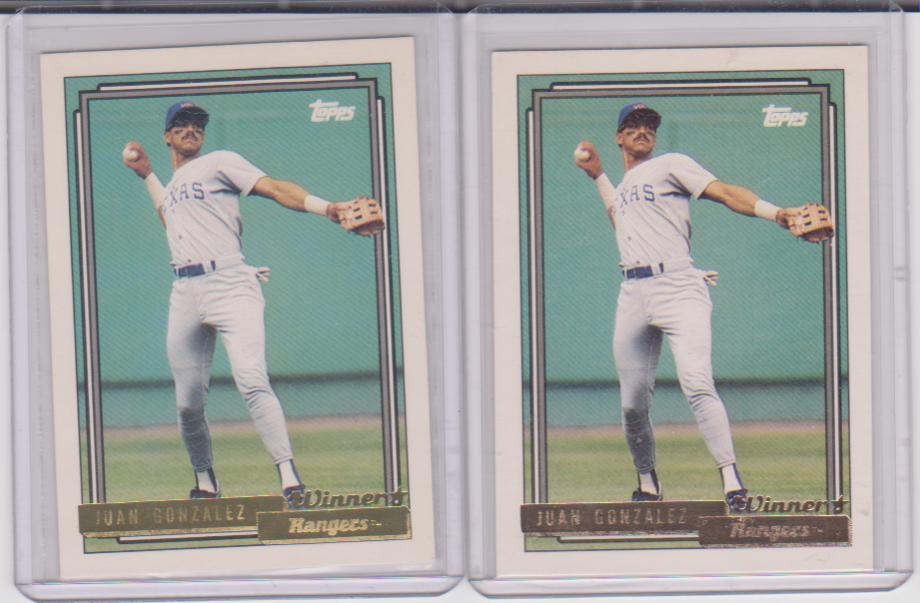There is nothing better than going through my collection a finding a error card,esp. one this rare...the silver winner was in my collection as a gold,so I had to pull a gold out of the doubles box to add it...Kinda hard to tell in the pic but the one on the right is a silver...On the flip side of that,I had to take a 98 tek diffractor off my collection because I found its just a regular tek...