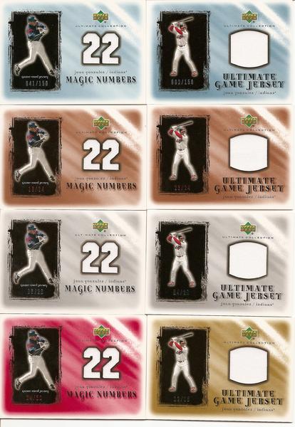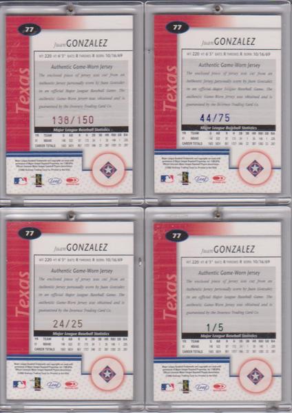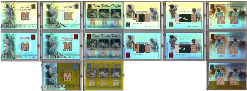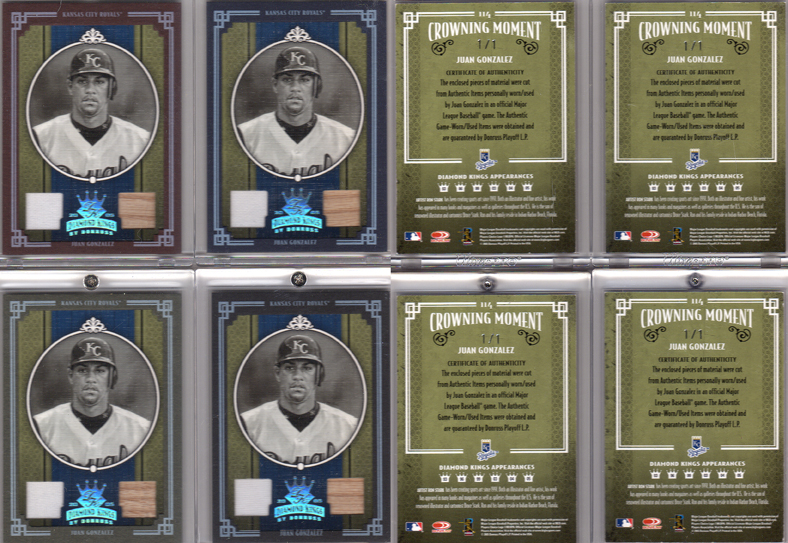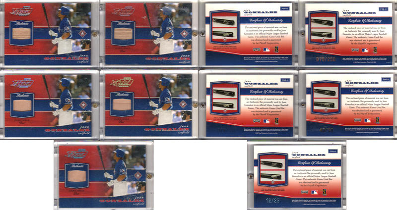 2- Juan of Juan's 2005 Diamond Kings Materials Framed B/W Platinum 1/1. 3- 2002 Playoff Piece of the game Bats. Last edited by adelith; 01-20-2010 at 01:47 PM. Reason: Adding Images |