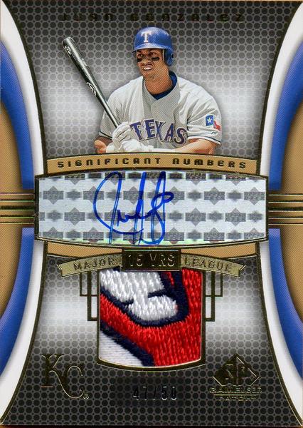 2002 Absolute Memorabilia Tools of the Trade Materials (jersey) 110/300 - this is the first one I've seen with a patch; I'm sure there are others out there 2002 Fleer Pemium International Pride Game Used Premium 49/75 2004 SP Game Used Patch Significant Numbers Autograph - Royals 47/50 |
