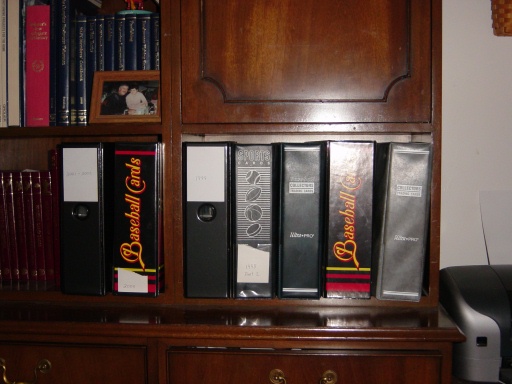 I keep two binders with the 1987-1996 cards in the safe. A dealer told me that the binders should be stored flat and not vertical. I have all of the good cards in penny sleeves and holders. I have graded cards limited cards and autograph cards in the safe. I am out of room in the safe. I have other stuff in drawers, cabinets, dresser. There is stuff all over the house. When I croak, I am sure that you guys could get this stuff cheap from my wife. We have a don't ask, don't tell. I keep telling her that there is nothing in my collection worth more than a dollar. She says, sure but if we ever get divorces she is taking every other card in my collection! She keeps wanting to know why any of the cards are in the safe if they are only worth a dollar? Any of you have a good answer?
