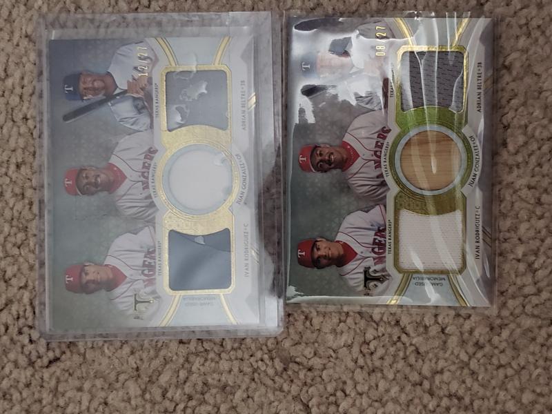 Hi guys!!! I recently purchased a 2018 Triple Play Relic Combo of Juan, Pudge and Beltre. After I got it I was like I already have it, but when I checked is different even though they are both numbered to 27. One has a Juan Bat and the other one has a Juan Jersey. Does anyone know how many are bat and how many are jersey??? Picture below!!!
