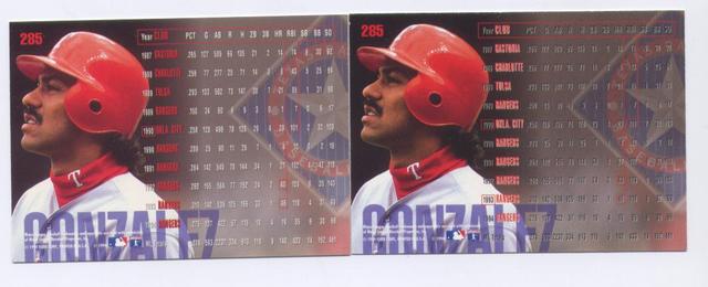 Not sure which is the common 1995 #285 fleer card. The one with the outlined numbers or the solid color numbers. Only have the two in my collection and the spare box doesn't have any in it. Someone will have to let me know which one is the more common one.