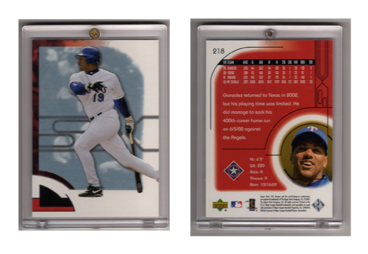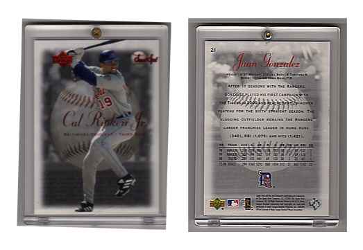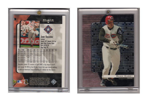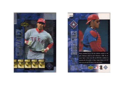 2- #48 2002 UD Authentics Reverse Negatives 3- #R42 2000 UD Ionix Reciprocal Error (Ivan Rodriguez Back, Juan Gonzalez Front) 4- 1999 Upper Deck Black Diamond (Sean Casey on Front) |