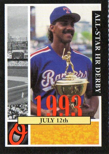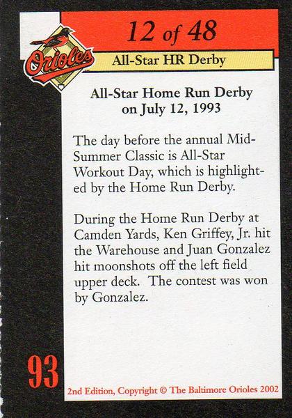This definitely belongs in the oddball section if you choose to include it. I believe that this smaller card came from a 2002 Baltimore Orioles program commemorating Juan's victory in the All Star Home Run Derby held at Camden Yards.