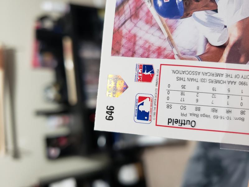 Hello guys!!!! I was going through some doubles I'm going to make a sale with and notice that a 1991 Upper Deck card has a different Holo logo on the back. The regular card has just the name Upper Deck inside the logo, but this one has baseballs holograms behind the name Upper Deck. Any info someone can provide is more that welcome!!! Loading a picture!!