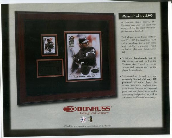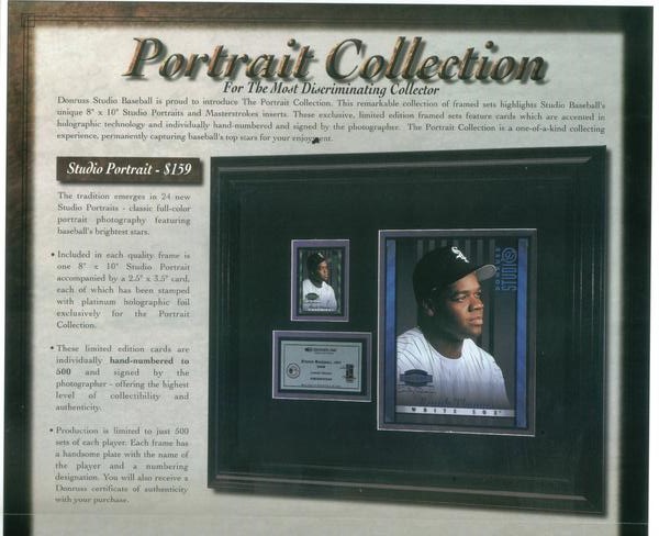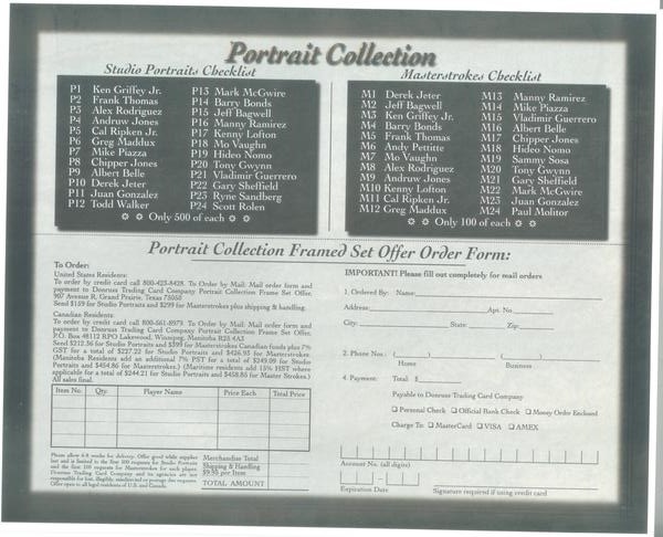 this is awesome it was sent to dealers from Donruss.it is a fold out.the first 2 scans are front and back. the last 2 are from the inside.would love to have Juan of both! he is in the check list for both. sorry i could not rotate properly. the Portraits are hand # to 500! the Masterstrokes are hand numbered to 100! WOW!!!