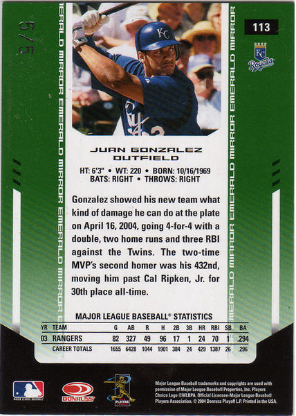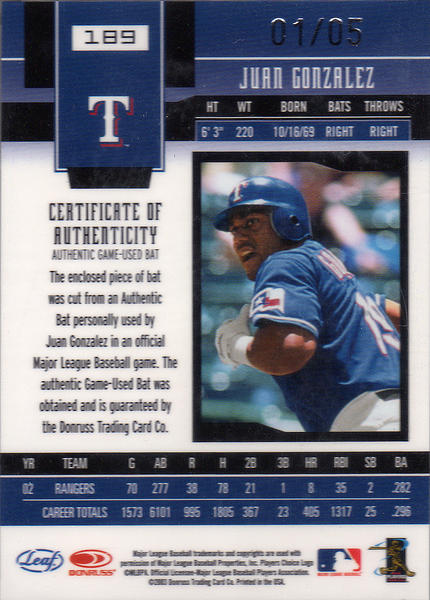 2- 113 2004 Leaf Certified Materials Mirror Autograph Emerald Back 3- 113 2004 Leaf Certified Materials Mirror Bat Emerald Front Same back picture applies for both cards since I own both 5/5 signature and bat. 4- 189 2003 Leaf Certified Materials Mirror Emerald Materials Bat Front 5- 189 2003 Leaf Certified Materials Mirror Emerald Materials Bat Back 6- Dr Pepper Card |