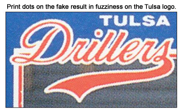 The cards are standard re-screened counterfeits, resulting in the usual telltale print dots. All areas of text on the cards should appear very crisp, but on the fakes, the print dot pattern creates a fuzzy appearance to all of the lettering and lines. The white letters, while not completely filled in with dots, do have a smattering of dots visible.