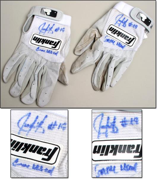 Juan Gonzalez probably drilled a couple of home runs in these white Franklin batting gloves. One of the most intimidating home run hitters in the '90's put solid use onto both gloves. Each glove showcases dirt marks embedded into the palm area. To finish it off, Gonzalez signed each glove ("9") in blue marker and inscribed "Game used."