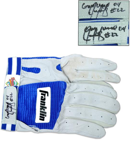 Kansas City Royals powerhouse and one-time Texas Ranger, Juan Gonzalez tagged an absolute perfect black Sharpie signature, with "Game Used 04" inscriptions on the wrist straps of this great pair of game-used Franklin batting gloves. Classic Franklin style in Royal-blue and gray.
