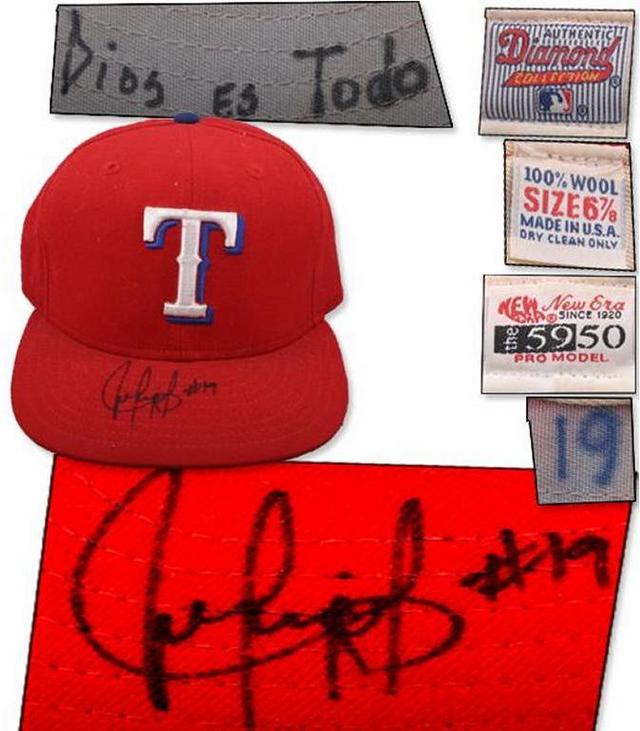 Terrific wear on this red Texas Rangers cap from this All-Star outfielder and 400 Home Run Club member. Number "19" and "Dios es Todo" in marker under visor. "New Era Size 6 7/8" tagging inside headband. Signed in perfect black sharpie on visor.
