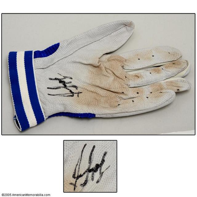 If Juan Gonzalez could have only avoided injuries through his 17-year career, he would have been a lock for Cooperstown. Offered is classic blue and gray "Franklin" batting glove used and signed by the former Texas Rangers great. Worn during one of his two MVP seasons, he signed it in black felt tip.