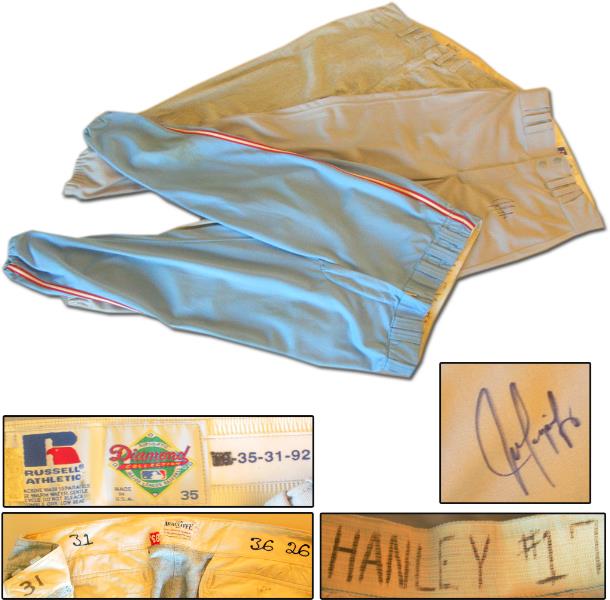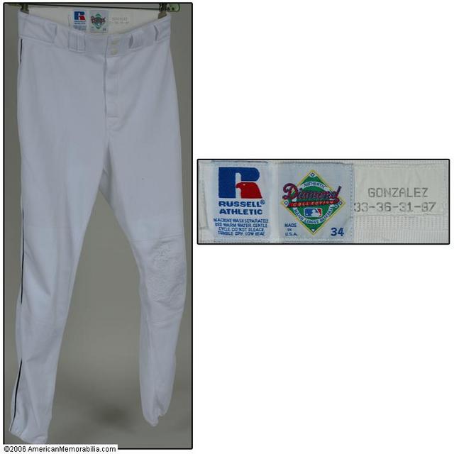 Juan Gonzalez Game-Worn Pants [size] 34 with heavy game wear. Brand is Russell Athletic with Gonzalez tag in interior waistband.