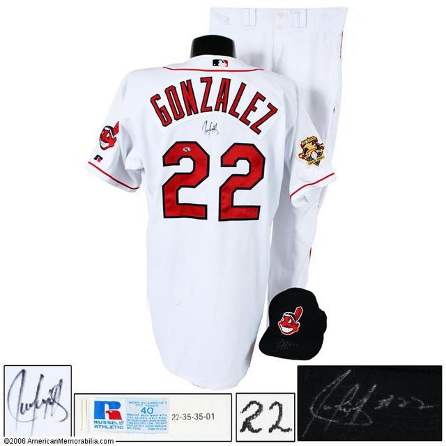 Similar to Rickey Henderson, Juan Gonzalez doesn't want to give up on the Major League experience. A potential comeback in 2006 was derailed but Juan Gone will resurface somewhere. The two-time MVP and homer happy slugger who was one of baseball's top players in the early 1990s. Offered is a complete 2001 game-worn uniform from the possible Hall of Famer. Light fraying and acceptable puckering are noticeable on the two-color red-on-navy blue tackle twill. The right sleeve contains a 100 Seasons American League gold patch. An Indians team patch comfortably rests on the left sleeve. An elaborate tail tagging system includes a Russell Athletic tag, "2001" year identifier and three flag tags: fabric/size, "2" Extra Length," and "2" Extra Sleeve Length." The full uniform also includes the pants and cap worn by Gonzalez while with the Indians. Gonzalez signed ("9") the jersey in black felt tip and the tip of the cap.