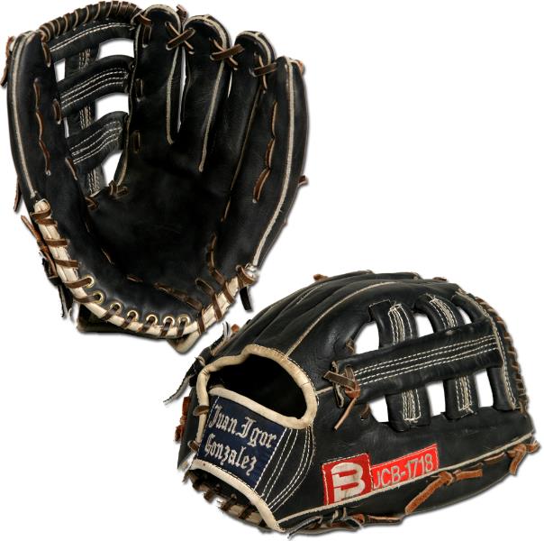 Lots of unique features are showcased on this Rollin Barazza (Mexican) Juan Gonzalez glove. Used in the early '90's by the man they call "Igor" (as so embroidered on the wrist strap), this JCB1718 model mitt has a conventional back, white binding and a dual-post "H" web. Nice game use on the aspiring Hall of Famer's glove.