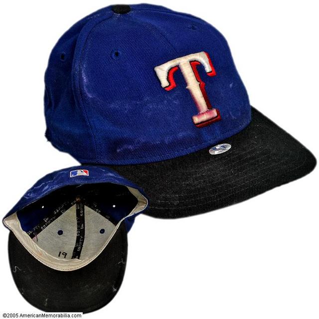 High Bid: $98 Auction Closed: 10/20/2005 How much use did Juan Gonzalez put into this hat? Well the entire cap is loaded with sweat stains. The button on the inside of the [size] "7 1/8" hat has rusted from salt contact. "19" is written into the on the inside in black felt tip and the bottom of the "T" on the front has turned to a shade of purple from excessive sweat. A classic hat which shows tremendous use from a borderline Hall of Famer. |