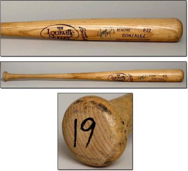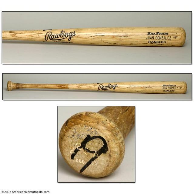 High Bid: $146 Auction Closed: 9/29/2005 The significance of this uncracked Juan Gonzalez gamer is that he used it in the 1993 season, when he paced the A.L. in home runs (46) and slugging percentage (.632). His Ranger uniform number ("19") is written in black marker on the knob. The flame-burned Rawlings 225A model is 35 inches in length and 32 ounces in weight. The handle shows light pine tar, while the barrel reveals ball and bat-rack blemishes. |