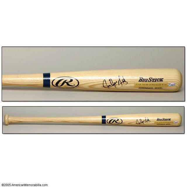 High Bid: $50 Auction Closed: 9/29/2005 Offered is a "MT" Rawlings Big Stick that has been signed by Juan "Igor" Gonzalez. The one-time Texas Rangers outfielder had quite the following in the collecting world during the 1990's. This perfectly-signed piece, with a limited edition gold plate, has been numbered 8/116. |